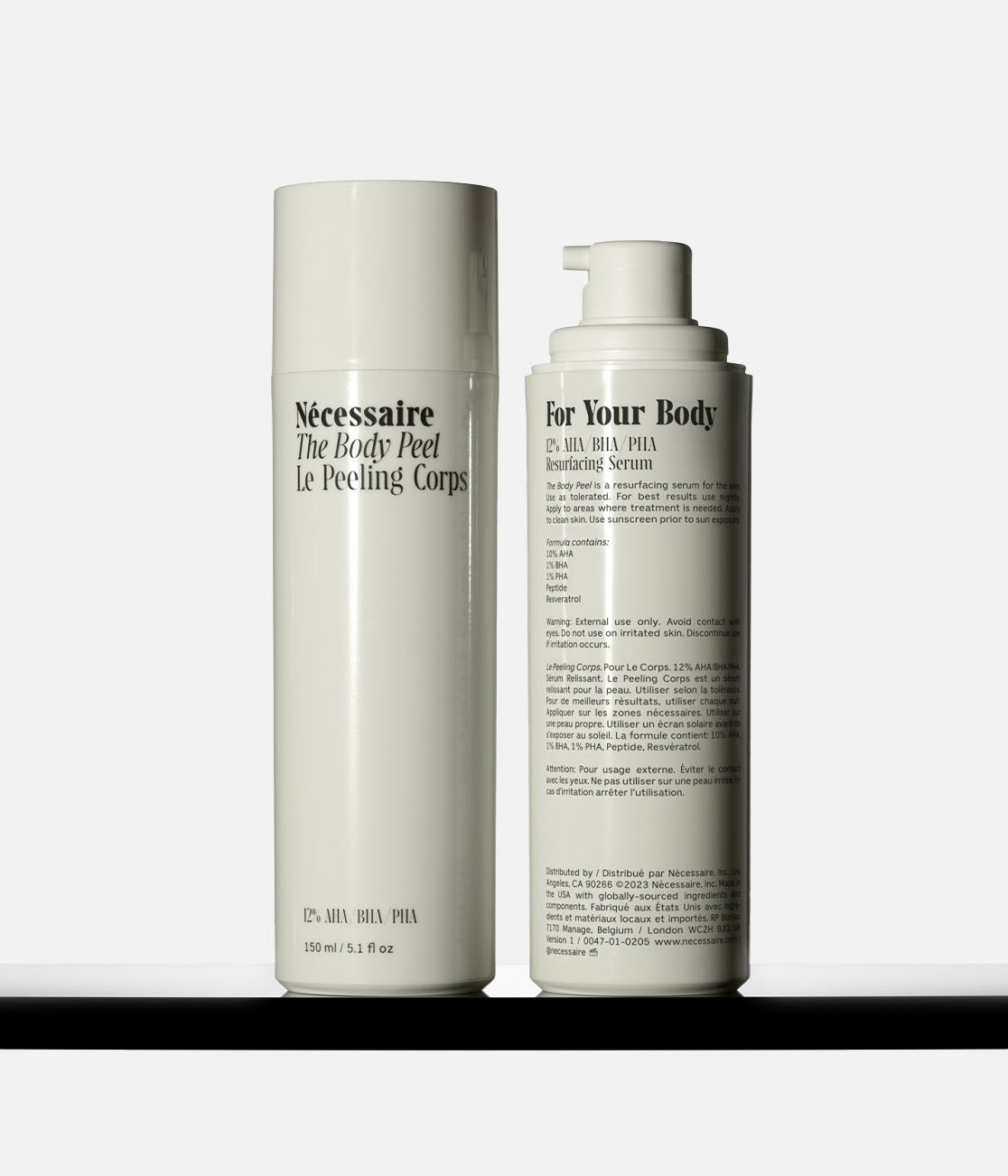The Body Peel is a leave-on exfoliation serum for the skin. This serum-in-gel pairs 12% AHA/BHA/PHA (Exfoliating Acids) with Glycerin, Niacinamide, and Resveratrol to help treat and prevent KP, ingrown hairs, and rough, textured skin patches for softer and smoother-looking skin. Due to the high % of chemical exfoliating acids The Body Peel is sticky upon application. Mix with moisturizer to minimize stickiness. Dermatologist-Tested. Hypoallergenic. Non-Comedogenic. Vegan. The Body Peel is packaged in our signature airless package for sustained efficacy and safety.