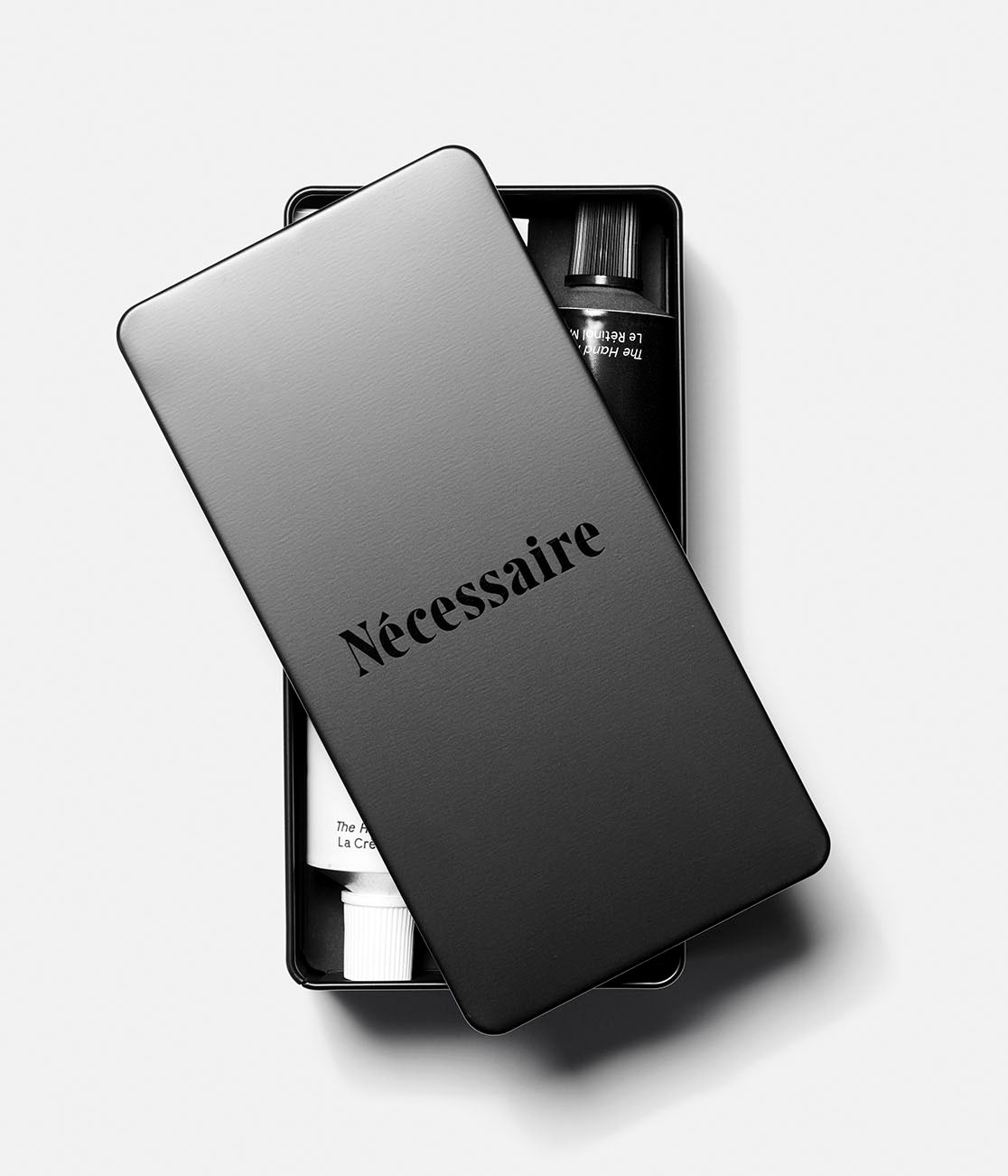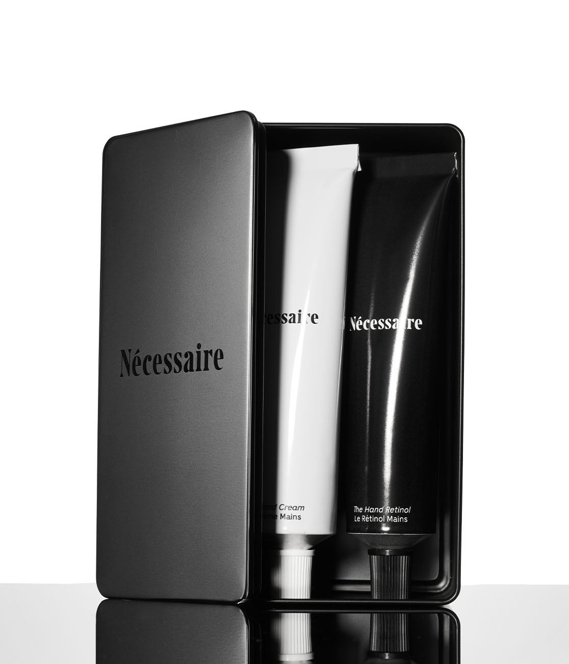 The Hand Duo + Gift Tin is the ultimate day-to-night ritual for winter hands, presented in a luxe black metal Nécessaire gift tin. The Hand Cream delivers daily nourishment with 5 Ceramides, 5 Peptides, Niacinamide. and Marula Butter to restore hydration and strengthen cuticles, while The Hand Retinol combines 0.25% Pure Retinol, AHA, Peptides, and Vitamins to smooth texture and improve the look of lines, spots, and marks overnight. The two-step system is fragrance-free for visible repair and renewal, that anyone you gift it to can indulge in. Dermatologist-Tested. Hypoallergenic. Non-Comedogenic. Vegan. Cruelty-Free. Fragrance-Free.