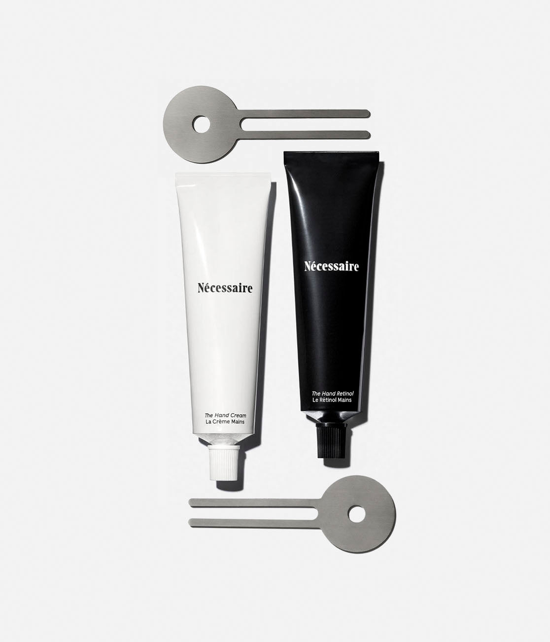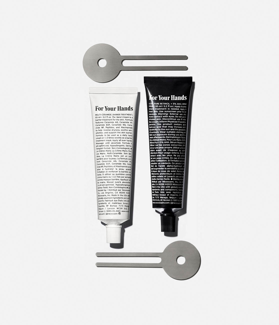 The Hand Duo + The Tube Keys pairs the day-night system with two (2) ergonomic keys made for aluminum tubes. The Hand Cream delivers instant moisture for dry, exposed skin. Niacinamide, Essential Ceramides (AG/AP/EOP/NG/NP), Marula Oil/Marula Butter rich in Vitamin C/E and Omega 6/9 are infused into luxe Shea Butter to help comfort skin, recover brittle cuticles, and support the barrier. The Hand Cream is ideal for day. The Hand Retinol is a repair serum for the skin. This serum-in-balm hybrid is infused with 0.25% Pure Encapsulated Retinol and AHAs (Glycolic Acid | Mandelic Acid) to help prevent and treat signs of age. With continued use, lines, wrinkles, spots, and marks start to fade and hardened cuticles soften. The Hand Retinol is ideal for night. The Tube Key is slightly oversized for an ergonomic roll. Made for re(use). Made in 100% Premium-Grade Stainless Steel.