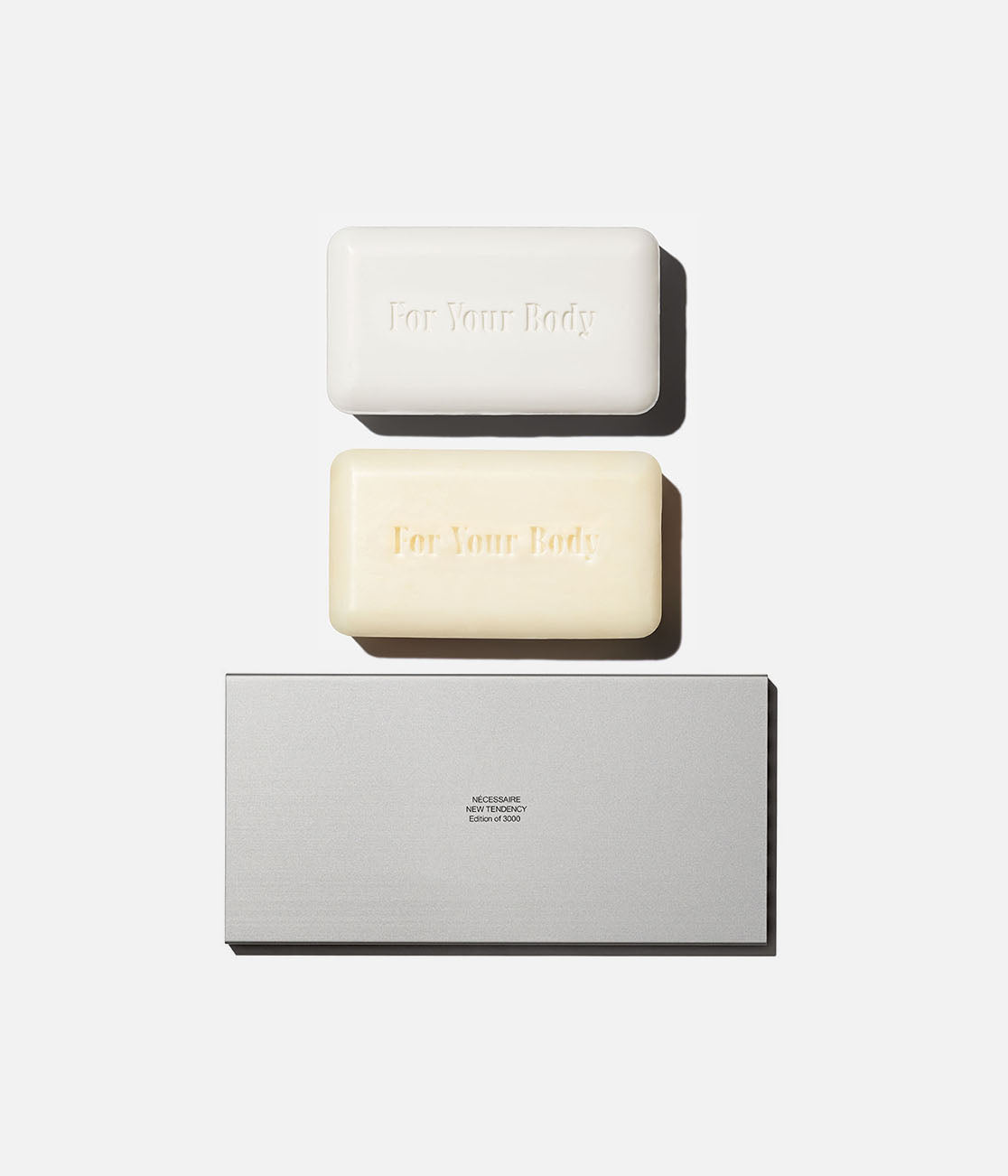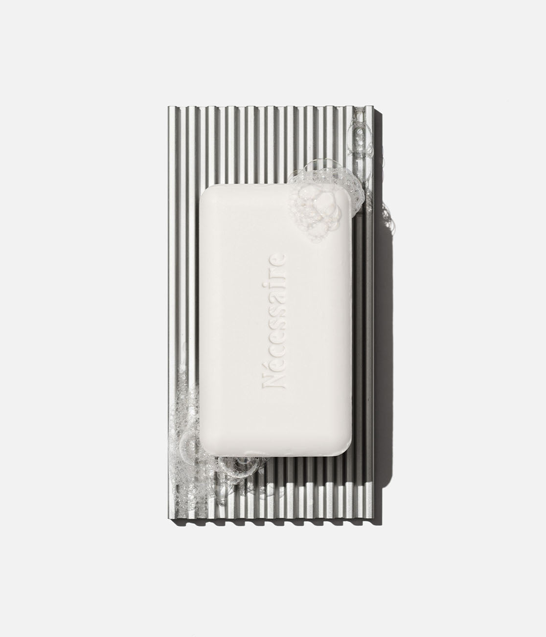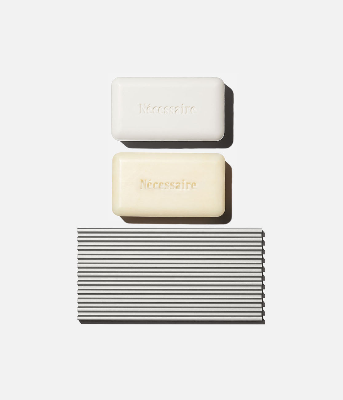 The Bars + The Soap Tray pairs two (2) in-shower bar treatments with a 100% Premium-Grade Aluminum tray. The Body Cleanse Bar is a rich, non-stripping, non-drying bar cleanse for skin. Avena Sativa, Amino Acids and Hyaluronic Acid combine with a high concentration of glycerin and gentle plant surfactants to provide a comforting cleanse. Made without Soap, SLS/SLES, Silicones, Phthalates, Parabens and PEGs. Fine fragrance notes of Moss, Bark, Bergamot and Rose for a classic experience. The Body Exfoliant Bar is a moderate-to-hard in-shower physical exfoliant for skin. 2% upcycled wood pulp (physical exfoliant) work with a high concentration of glycerin, plant oils, and plant surfactants to help treat and prevent KP, ingrown hairs, and rough, textured skin patches for softer and smoother-looking skin. The Body Exfoliant Bar is to be applied directly to skin for a textured sensorial experience. Made without SLS/SLES, Silicones, Phthalates, Parabens and PEGs. Fragrance-Free. The Soap Tray is sized to hold one (1) soap bar in a classic lay-down or two (2) soap bars side-by-side standing up. Made for re(use).